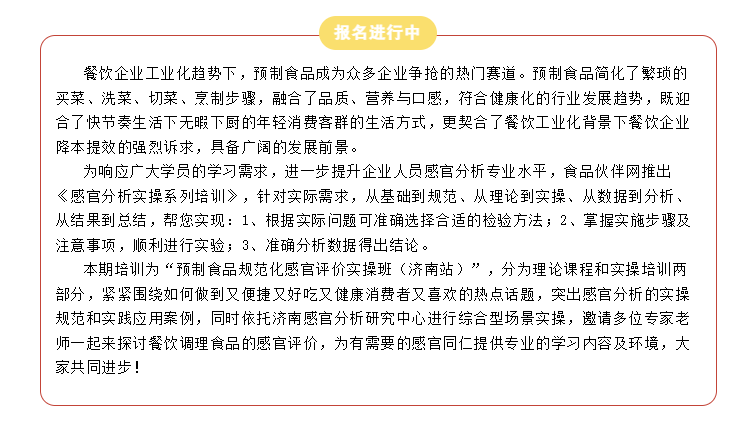 持續(xù)招生〡12月SEPA預(yù)制食品規(guī)范化感官評(píng)價(jià)實(shí)操班,我們?cè)跐?jì)南等您!
