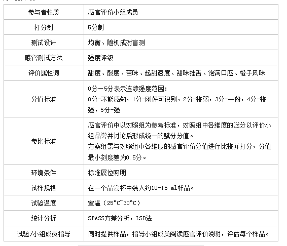伊比西經(jīng)過多輪調(diào)試后,最終確定方案采用普魯斯特200濃縮香精及席蔓200LN 01濃縮香精兩支產(chǎn)品,并對最終方案進行了內(nèi)部感官評價小組感官測試,并給出相應(yīng)的感官評價結(jié)果。具體感官評價方法如下表: