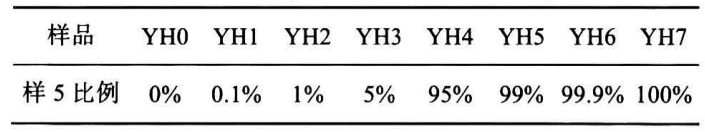 由圖6可知,2個(gè)主成分的貢獻(xiàn)率分別為59.444%、31.689%,總貢獻(xiàn)率可達(dá)9l_3l%,其中GH0為純的4號(hào)樣,GH4為純的3號(hào)樣,二者數(shù)據(jù)點(diǎn)分布區(qū)分明顯,并且由樣GHI與二者數(shù)據(jù)分布較遠(yuǎn)可以得出,檢測限可低至0.1%,仍可區(qū)分。由圖7可知,DFA方法的2個(gè)主成分貢獻(xiàn)率為63.226%、35.152%,總貢獻(xiàn)率可達(dá)98.38%,且純的3號(hào)樣與純的4號(hào)樣區(qū)分明顯,各摻雜比例的數(shù)據(jù)點(diǎn)分布也無重復(fù)區(qū)域。比較圖6,圖7可以看出DFA方法明顯優(yōu)于PCA方法。且2種方法都可以明顯地區(qū)分這兩者的摻雜。