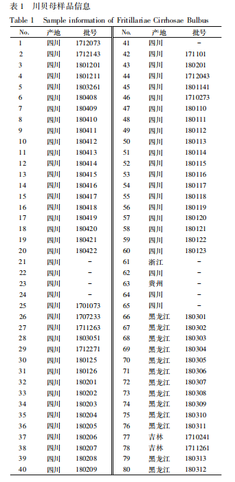 外觀性狀不滿足的樣本有23,24,43~46,61~80 號(hào); 顯微結(jié)果顯示樣本 71,74,78 號(hào)不含螺紋導(dǎo)管,其余均滿足藥典要求; 薄層結(jié)果顯示樣本 23,24 號(hào)中不含貝母素乙,61~80 號(hào)與平貝母對(duì)照藥材相對(duì)應(yīng)的位置顯相同顏色的斑點(diǎn); 80 個(gè)樣本貝母素甲、西貝母堿、貝母素乙 3 種生物堿總量均為 0~0. 05%,判別結(jié)果見表 2。