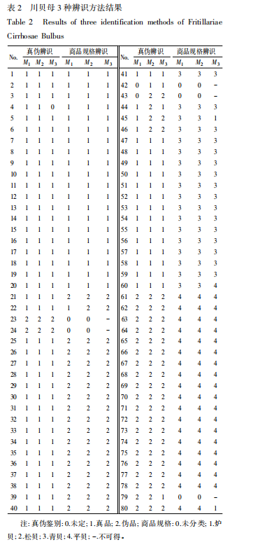 聘請(qǐng) 8 位在中藥鑒定研究領(lǐng)域擁有豐富經(jīng)驗(yàn)的專家( 具有 15 年以上工作經(jīng)驗(yàn)且一直在醫(yī)藥行業(yè)從事中藥飲片檢驗(yàn)、鑒定工作) ,參照 2015 年版《中國(guó)藥典》一部質(zhì)量標(biāo)準(zhǔn)外觀性狀規(guī)定,將編號(hào)后的樣品隨機(jī)放置,由專家依據(jù)顏色、形狀、氣味、質(zhì)地、口感等差異結(jié)合既往經(jīng)驗(yàn)進(jìn)行鑒定,對(duì)川貝母的真?zhèn)渭吧唐芬?guī)格做出鑒定。最后,以評(píng)價(jià)專家人數(shù)是否≥3 /4 比例原則確定每個(gè)樣本的真?zhèn)渭吧唐芬?guī)格。