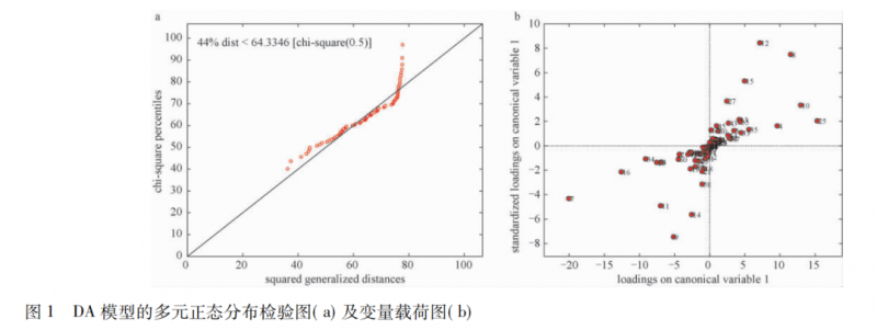 DA 辨識(shí)模型及交互驗(yàn)證 80 個(gè)樣本的測(cè)試結(jié)果多元正態(tài)分布檢驗(yàn)圖見圖 1,橫坐標(biāo)為平方廣義距離,縱坐標(biāo)為卡方上側(cè)分位數(shù)對(duì)應(yīng)的檢驗(yàn)值。樣本分布圖形略呈線性; 約 44%的距離小于卡方分布分位數(shù)表 0. 5 對(duì)應(yīng)的檢驗(yàn)值,說(shuō)明檢驗(yàn)值在卡方分布分位數(shù)表 0. 5 對(duì)應(yīng)的檢驗(yàn)值的下側(cè)分布略微集中。