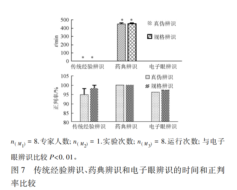 通過比較,電子眼辨識(shí)與傳統(tǒng)經(jīng)驗(yàn)辨識(shí)正判率無(wú)顯著性差異; 電子眼辨識(shí)不如傳統(tǒng)經(jīng)驗(yàn)辨識(shí)快( P<0. 01) ,但較藥典檢測(cè)快( P<0. 01) ,見圖 7。