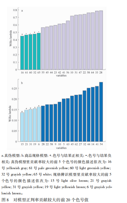 在只考慮變量信息本身、不考慮分類結(jié)果模型的情況下,65 個(gè)變量所攜帶變異信息( Wilkslamda) 的柱狀圖見圖 8,Wilkslamda 越小則表示變量攜帶變異信息越多。真?zhèn)伪孀R(shí)中 65 個(gè)變量在潛變量上的載荷圖,見圖 2,50 號(hào)變量在原點(diǎn)附近,說(shuō)明該特征屬性的波動(dòng)對(duì)于樣本之間的區(qū)別貢獻(xiàn)不大,其余64 個(gè)變量整體較為分散,說(shuō)明這 64 個(gè)變量均攜帶有顯著的變異信息。商品規(guī)格辨識(shí)中 65 個(gè)變量在潛變量上的載荷圖見圖 6。