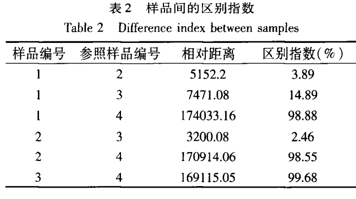 區(qū)別指數(shù)是基于主成分分析圖中的兩個(gè)樣品組簇團(tuán)之間的相對距離計(jì)算而出的,兩個(gè)樣品組間簇團(tuán)距離越大同時(shí)樣品組內(nèi)的差異越小,則兩個(gè)樣品組的區(qū)別指數(shù)就越接近100%,即區(qū)別指數(shù)越大則表示樣品組間的區(qū)別越大,反之越小。如表2所示,4號(hào)奶粉樣品與1號(hào)巴氏奶、2號(hào)超巴氏奶及3號(hào)超高溫滅菌奶的區(qū)別指數(shù)均較大,且與3號(hào)超高溫滅菌奶的差異最大。同時(shí),2號(hào)超巴氏奶與3號(hào)超高溫滅菌奶的區(qū)別指數(shù)最小,則表明差異最小。