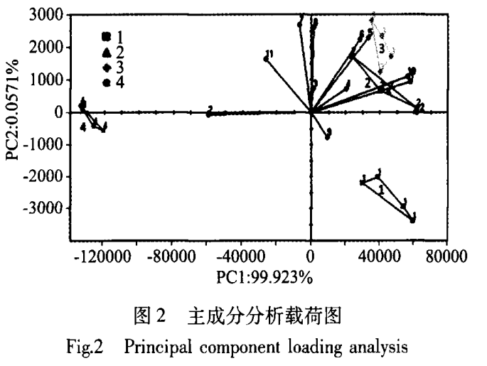 對電子鼻采集的樣品數(shù)據(jù)運(yùn)用儀器Alphasoft軟件中多變量統(tǒng)計(jì)分析,來實(shí)現(xiàn)主成分分析、樣品間區(qū)別指數(shù)分析和主成分載荷圖分析;結(jié)合保留指數(shù)和AroChembase數(shù)據(jù)庫對未知化合物進(jìn)行定性分析。