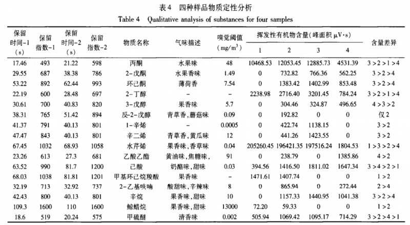 結(jié)合保留指數(shù)和Aro Chem base數(shù)據(jù)庫對特異性化合物進(jìn)行定性及含量分析,不同加工方式牛奶的氣相色譜圖如圖3所示,可能含有的化合物見表4所示。閾值的大小代表了物質(zhì)氣味的強(qiáng)弱,相同含量的兩種物質(zhì),閾值越低則表示氣味越強(qiáng)烈。在表4物質(zhì)定性中假設(shè)各物質(zhì)含量相同的前提下,水介質(zhì)中氣味最強(qiáng)的物質(zhì)是1一辛烯(閾值是5X 10‘4)。同時(shí),由于儀器的檢測器是氫離子火焰檢測器,為質(zhì)量型檢測器,物質(zhì)含量的高低則表現(xiàn)在峰面積大小上,表4中列出了在各個(gè)保留時(shí)間上的峰面積,并通過峰面積大小對樣品含量的差別進(jìn)行排序。結(jié)果顯示隨著加工溫度升高,丙酮、2一丁醇、辛二烯、己酸和甲硫醚的含量也隨之增多。同時(shí),甲基環(huán)己烷羧酸、丙酮、2一丁醇和水芹烯在奶粉的加工工藝中出現(xiàn)了大量的損失。甲硫醚是牛乳產(chǎn)品中特有的有機(jī)化合物,且其嗅覺閾值較低,氣味強(qiáng)度較高,其含量稍高便會(huì)產(chǎn)生異味。如表4所示,甲硫醚在巴氏奶中的含量比在超巴氏和超高溫滅菌奶中的低,因此加工工藝對甲硫醚的含量產(chǎn)生了一定的影響,從而影響了樣品的整體風(fēng)味。