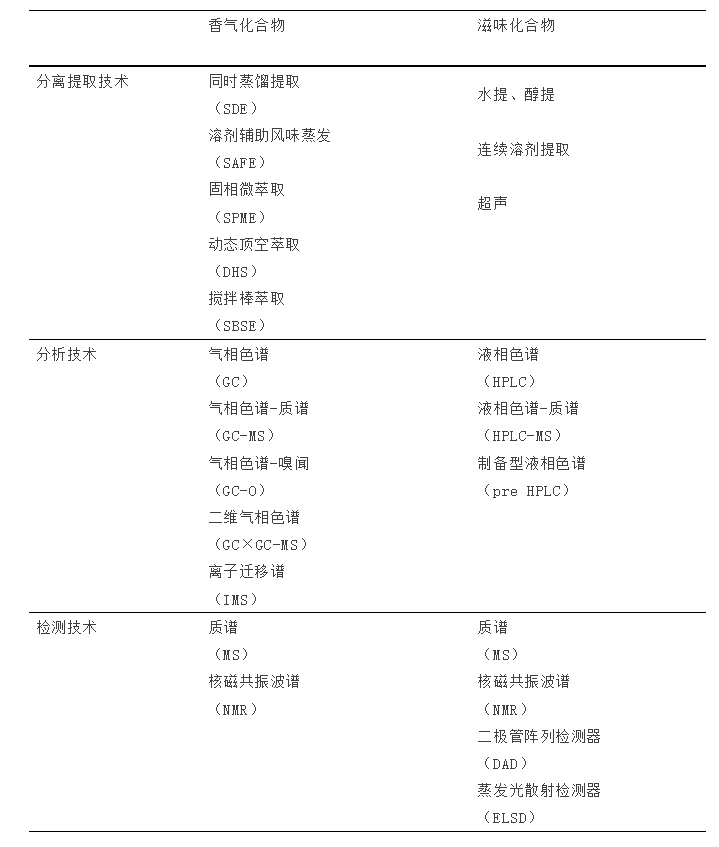 有關(guān)分子感官科學(xué)涉及的分離分析技術(shù)和手段的歸納見表2。