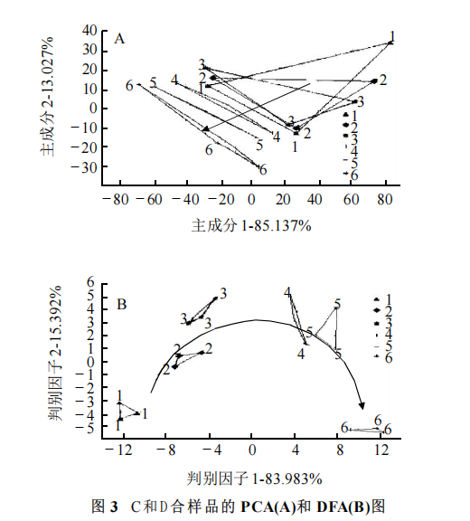 樣品準(zhǔn)備 樣品 C 和 D 進(jìn)行混合,混合比例 C:D(V/V)為 10:90 、30:70 、50:50 、70:30 、90:10 、100:0,編號(hào)分別為1、2、3、4、5、6。 傳感器信號(hào)分析 檢測(cè)每一個(gè)樣品時(shí)傳感器共采集120s 。在進(jìn)行數(shù)據(jù)分析與處理時(shí),采用第120秒所得的穩(wěn)定數(shù)據(jù)作為輸出值進(jìn)行分析。 數(shù)據(jù)分析方法 根據(jù)傳感器采集的原始數(shù)據(jù),分別采用主成分分析 (PCA) 、判別因子分析 (DFA)和偏最小二乘回歸分析(PLS)分析。 結(jié)果與分析 不同品牌啤酒對(duì)比 主成分分析(PCA) PCA 是將所提取的傳感器多指標(biāo)的信息進(jìn)行數(shù)據(jù)轉(zhuǎn)換和降維,并對(duì)降維后的特征向量進(jìn)行線性分類,最后在PCA圖上顯示主要的兩維圖。橫、縱坐標(biāo)分別表示在 PCA 轉(zhuǎn)換中得到的第一主成分(PC1)和第二主成分(PC2)的貢獻(xiàn)率(或權(quán)重) ,貢獻(xiàn)率越大,說(shuō)明主成分可以較好地反映原來(lái)多指標(biāo)的信息 。