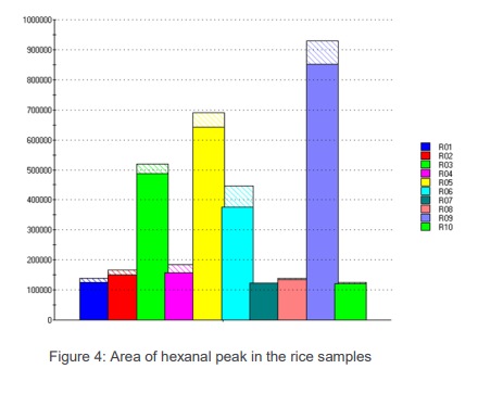 比較其己醛的含量可知大米的氧化水平,比較2-乙?;?1-吡咯啉含量可知其特征香味在大米中的含量。