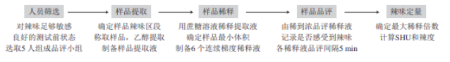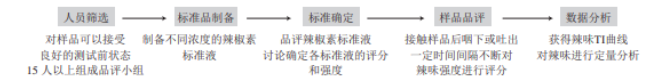 時間-強度( time-intensity,TI)法是一種用于評價樣品辣味隨時間變化的感官評價手段,是經(jīng)典感官評分方法的延伸,這種方法常利用不同濃度的辣椒素標準品使參評人員建立相對統(tǒng)一的感官評價標準,并要求品評員在攝入樣品后的一段時間內(nèi)持續(xù)地對辣味的強弱進行打分。TI法的基本操作流程如下所示。