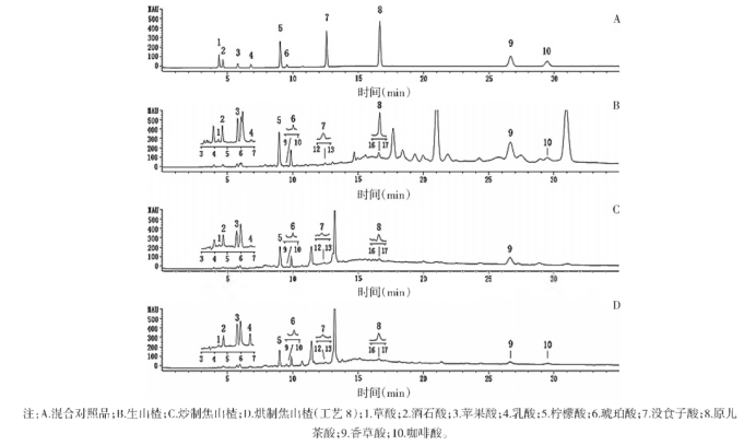 樣品測(cè)定 取山楂飲片,粉碎后過80目篩,稱取過篩后細(xì)粉1.0g,加25mL純水,30℃超聲30min,4000r離心10min,離心半徑15cm,取上清液過0.45μm微孔濾膜,每組樣品制備3份,生山楂、炒制焦山楂和烘制焦山楂(工藝8)的液相色譜圖見圖2。