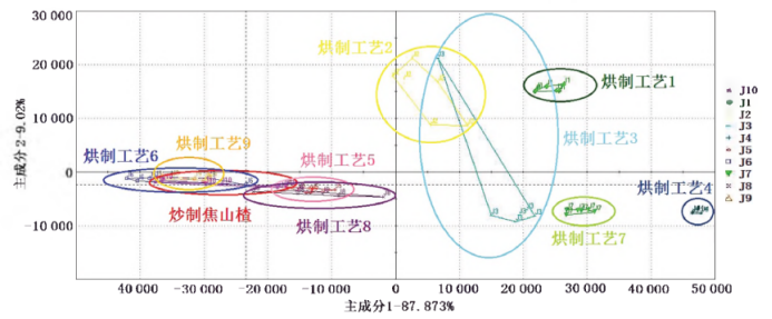 在快速氣相電子鼻中獲得的各焦山楂炮制品的氣相色譜信息,以峰面積作為PCA分析的輸入值,對(duì)炒制焦山楂和烘制焦山楂進(jìn)行分析比較,結(jié)果見圖3。從PCA二維圖中可知主成分1(PC1)和主成分2(PC2)總貢獻(xiàn)率為96.893%,能較好地反映原始數(shù)據(jù)信息。烘制工藝5、6、8、9制備的焦山楂與炒制焦山楂的分布區(qū)域較為接近,而烘制工藝1、2、3、4、7制備的焦山楂與炒制焦山楂的分布區(qū)域相距較遠(yuǎn),說明烘制工藝5、6、8、9制備的焦山楂與炒制焦山楂相似程度更高。