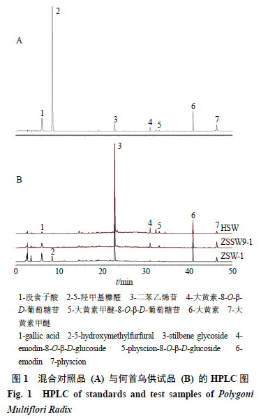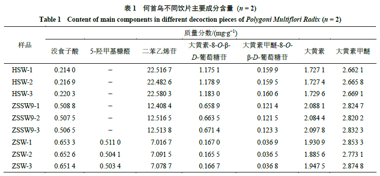 2.2.2 對照品溶液的制備 精密稱定沒食子酸、5-羥甲基糠醛、二苯乙烯苷、大黃素-8-O-β-D-葡萄糖苷、大黃素甲醚-8-O-β-D-葡萄糖苷、大黃素、大黃素甲醚對照品各適量,分別加80%甲醇制成質(zhì)量濃度分別為57.6、68.4、625.0、50.2、8.6、180.0、0.216 μg/mL的對照品溶液,即得。 2.2.3 供試品溶液的制備 取何首烏飲片粉末(過40目篩)約1 g,精密稱定,置平底燒瓶中,精密加入80%甲醇25 mL,密塞,稱定質(zhì)量,加熱回流提取30 min,放冷,密塞,再稱定質(zhì)量,用80%甲醇補足減失的質(zhì)量,搖勻,經(jīng)微孔濾膜(0.45 μm)濾過,即得。 2.2.4 線性關(guān)系考察 分別精密吸取對照品溶液1、5、10、15、20、25 μL,注入液相色譜儀,按“2.2.1”項下色譜條件測定,以對照品質(zhì)量濃度為橫坐標(biāo)(X),峰面積為縱坐標(biāo)(Y)繪制標(biāo)準(zhǔn)曲線,并計算得到回歸方程與線性范圍,結(jié)果分別為沒食子酸Y=28 655.693 5 X-3 449.895 2,R2=1.000 0,線性范圍5.76~144.00 mg/L;5-羥甲基糠醛Y=78 294.955 3 X+11 679.404 8,R2=1.000 0,線性范圍6.84~171.00 mg/L;二苯乙烯苷Y=16 640.258 1 X+12 599.471 0,R2=0.999 9,線性范圍62.50~1 562.50 mg/L;大黃素-8-O-β-D-葡萄糖苷Y=30 743.247 5 X-9 558.630 6,R2=0.999 9,線性范圍5.02~125.50 mg/L;大黃素甲醚-8-O-β-D-葡萄糖苷Y=27 693.578 4 X-241.880 6,R2=1.000 0,線性范圍0.86~21.50 mg/L;大黃素Y=34 965.433 1 X-22 341.082 3,R2=0.999 9,線性范圍18.00~450.00 mg/L;大黃素甲醚Y=37 991.286 3 X+8 456.727 4,R2=1.000 0,線性范圍21.60~540.00 mg/L;結(jié)果表明,各對照品在各自范圍內(nèi)線性關(guān)系良好。 2.2.5 精密度試驗 精密吸取供試品溶液(ZSW-1)10 μL,重復(fù)進(jìn)樣6次,按“2.2.1”項下色譜條件測定,6次測定結(jié)果顯示,沒食子酸、5-羥甲基糠醛、二苯乙烯苷、大黃素-8-O-β-D-葡萄糖苷、大黃素甲醚-8-O-β-D-葡萄糖苷、大黃素、大黃素甲醚峰面積的RSD分別為0.17%、0.39%、0.31%、0.54%、1.64%、0.21%、0.63%,表明儀器精密度良好。 2.2.6 穩(wěn)定性試驗 精密吸取供試品溶液(ZSW-1)10 μL,分別于制備后0、2、4、8、12、24 h進(jìn)樣共6次,按“2.2.1”項下色譜條件測定,結(jié)果沒食子酸、5-羥甲基糠醛、二苯乙烯苷、大黃素-8-O-β-D-葡萄糖苷、大黃素甲醚-8-O-β-D-葡萄糖苷、大黃素、大黃素甲醚峰面積的RSD分別為0.52%、0.82%、0.36%、1.38%、1.54%、0.39%、0.90%,表明供試品溶液在24 h內(nèi)保持穩(wěn)定。 2.2.7 重復(fù)性試驗 取制何首烏粉末(ZSW-1)約1 g,精密稱定,共6份,按“2.2.3”項下方法制備供試品溶液,分別精密吸取10 μL,注入液相色譜儀,按“2.2.1”項下色譜條件測定,記錄峰面積并計算各成分含量,結(jié)果沒食子酸、5-羥甲基糠醛、二苯乙烯苷、大黃素-8-O-β-D-葡萄糖苷、大黃素甲醚-8-O-β-D-葡萄糖苷、大黃素、大黃素甲醚含量的RSD分別為0.33%、0.92%、0.08%、1.65%、1.67%、1.59%、1.90%,表明該方法重復(fù)性良好。 2.2.8 加樣回收率試驗 精密稱定已測定指標(biāo)成分含量的何首烏粉末(ZSW-1)約0.5 g,共6份,置平底燒瓶中,分別加入對照品適量,按“2.2.3”項下方法制備供試品溶液。精密吸取上述樣品與對照品溶液各10 μL,注入液相色譜儀,按“2.2.1”項下色譜條件進(jìn)行測定,記錄峰面積并計算加樣回收率,沒食子酸、5-羥甲基糠醛、二苯乙烯苷、大黃素-8-O-β-D-葡萄糖苷、大黃素甲醚-8-O-β-D-葡萄糖苷、大黃素、大黃素甲醚的平均加樣回收率分別為98.88%、97.99%、97.32%、102.85%、108.12%、96.67%、99.33%,RSD分別為0.36%、0.74%、0.33%、0.74%、0.93%、0.43%、1.16%,均符合《中國藥典》2020年版規(guī)定標(biāo)準(zhǔn)。 2.2.9 樣品測定 分別稱取生何首烏、九蒸九曬何首烏、藥典法制何首烏飲片適量,按“2.2.3”項下方法制備供試品溶液,每個樣品平行2次,按“2.2.1”項下色譜條件進(jìn)行測定,記錄峰面積并計算各成分含量,結(jié)果見表1。含量測定結(jié)果表明,何首烏不同飲片中均含有沒食子酸、二苯乙烯苷、大黃素-8-O-β-D-葡萄糖苷、大黃素甲醚-8-O-β-D-葡萄糖苷、大黃素、大黃素甲醚6種成分,但不同飲片間各成分含量存在一定差異。九蒸九曬、藥典法制何首烏中沒食子酸及蒽醌苷元類成分的含量與生何首烏相比,均有不同程度的增加,其中以沒食子酸含量增加最為顯著,藥典法制何首烏約為生品的3倍,九蒸九曬何首烏約為生品的2倍。炮制為制何首烏后,苷類(二苯乙烯苷、蒽醌苷)成分含量顯著減少,與生何首烏相比,九蒸九曬何首烏中二苯乙烯苷含量減少了約44%,蒽醌苷類成分含量減少了約41%;藥典法制何首烏中二苯乙烯苷含量減少了約69%,蒽醌苷類成分含量減少了約85%;而5-羥甲基糠醛僅在藥典法制何首烏飲片中檢出,平均質(zhì)量分?jǐn)?shù)為0.506 1 mg/g。