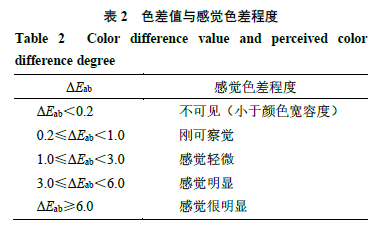 2.3基于電子眼技術(shù)的顏色分析 電子眼采用的色彩系統(tǒng)中L*代表明度指數(shù),a*(紅-綠軸)、b*(黃-藍(lán)軸)代表顏色對立維度。對于樣品1、2,ΔL*=L1*-L2*,為正值時樣品1顏色偏淺,為負(fù)值時樣品1顏色偏深。Δa*=a1*-a2*,為正值時樣品1顏色偏紅,為負(fù)值時樣品1顏色偏綠。Δb*=b1*-b2*,為正值時樣品1顏色偏黃,為負(fù)值時樣品1顏色偏藍(lán)。樣品顏色可用色度值(Eab*)表示,計算公式為Eab*=(L*2+a*2+b*2)1/2。2個樣品之間的色差為ΔEab,計算公式為ΔEab=(ΔL*2+Δa*2+Δb*2)1/2,色差值與人眼感覺色差程度的關(guān)系見表2。