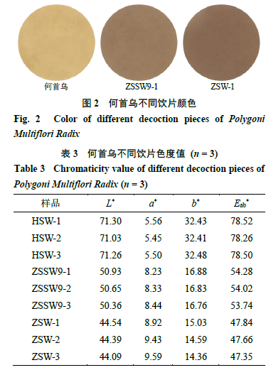 2.3.1 視覺分析儀參數(shù)設(shè)置及供試品前處理 開啟IRIS視覺分析儀,預(yù)熱15 min,待指示燈顯示綠燈后,校準(zhǔn)儀器鏡頭的曝光度和焦距,使用24色色彩校正板對儀器進(jìn)行校準(zhǔn)。校準(zhǔn)完成后設(shè)置照明模式為頂部及底部照明,拍照模式為單一快照。取適量何首烏供試品粉末(過40目篩)于扁形稱量瓶中,壓平,置于儀器測量白板上,變換位置,平行拍照3次,記錄樣品粉末色號及比例,計算樣品色度空間參數(shù)L*、a*、b*值、樣品色度值(Eab*值)及各樣品間的ΔEab值。 2.3.2何首烏不同飲片顏色比較 觀察各樣品顏色,可見何首烏不同飲片顏色差異明顯,結(jié)果見圖2。何首烏不同飲片樣品色度值比較見表3。經(jīng)電子眼測定,九蒸九曬何首烏與生何首烏的ΔEab>6.0,顏色色差感覺很明顯,兩者ΔL*為負(fù),Δa*為正,Δb*為負(fù);藥典法制何首烏與生何首烏的ΔEab>6.0,顏色色差感覺很明顯,兩者ΔL*為負(fù),Δa*為正,Δb*為負(fù),說明經(jīng)九蒸九曬及藥典法炮制后何首烏飲片顏色均變深變紅變藍(lán);藥典法制何首烏與九蒸九曬何首烏的ΔL*為負(fù),Δa*為正,Δb*為負(fù),說明藥典法制何首烏飲片較九蒸九曬何首烏飲片顏色變化程度更深。