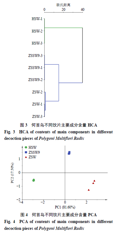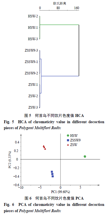 3 討論 本實驗分別采用50%、80%、100%甲醇及50%、80%、100%乙醇作為提取溶劑考察對各成分含量的影響,結(jié)果表明以80%甲醇提取各成分含量較高且峰形良好,因此選用80%甲醇作為提取溶劑;分別比較了超聲15、30、45、60 min,回流30、60、90、120 min,冷浸4、8、12 h對各成分含量的影響,結(jié)果表明回流對各成分的提取率較高,且不同回流時間下提取率差異不大,因此選用回流30 min作為提取方法。通過對提取方法的考察,最終確定本實驗供試品溶液的制備方法為80%甲醇回流提取30 min。本實驗通過對古代經(jīng)典九蒸九曬炮制法與藥典法制何首烏飲片的對比研究,發(fā)現(xiàn)二者主要成分含量及顏色的總體變化趨勢較為相似,但有程度上的差異,且二者成分組成也有明顯的區(qū)別。 何首烏中含有鞣質(zhì)類成分和具有沒食子?;能疹惓煞?sup>[20-21],在炮制過程中上述成分受熱分解后轉(zhuǎn)化為沒食子酸[22-23],故炮制后沒食子酸量顯著增加。二苯乙烯和蒽醌類成分是何首烏中的主要有效成分,同時也是其肝毒性的主要物質(zhì)基礎(chǔ)[24-25],二者的含量及結(jié)構(gòu)與何首烏肝損傷的發(fā)生密切相關(guān),可通過控制合理的炮制工藝,將上述2類成分的含量控制在安全有效的范圍內(nèi),以便提高用藥的安全性[26]。二苯乙烯及蒽醌類成分對光、熱具有不穩(wěn)定性[27-28],在加熱炮制過程中會發(fā)生分解,在反復(fù)蒸、曬過程中會發(fā)生光環(huán)加成反應(yīng)[29],因此,采用連續(xù)加熱方式的藥典法制何首烏比采用間隔蒸、曬方式的九蒸九曬何首烏中上述2類成分含量降低的幅度更為顯著。 5-羥甲基糠醛既是Maillard反應(yīng)產(chǎn)物,又可通過糖的直接降解或脫水產(chǎn)生[30-31],溫度的升高和加熱時間的延長均可導(dǎo)致其含量增加[32],因此5-羥甲基糠醛成為很多采用加熱炮制(炒制、蒸制、燉制等)中藥飲片的特征性標(biāo)志物。何首烏中含有的糖類成分以及炮制過程中苷類分解產(chǎn)生的糖類成分均可與氨基成分發(fā)生Maillard反應(yīng),從而生成5-羥甲基糠醛。本實驗中僅在藥典法制何首烏飲片中檢測到了5-羥甲基糠醛,而九蒸九曬何首烏飲片中未檢出該成分,說明5-羥甲基糠醛的產(chǎn)生與炮制工藝密切相關(guān)。藥典法采用液體輔料連續(xù)燉制,而九蒸九曬法采用固體輔料間隔蒸、曬,何首烏飲片在兩種方法炮制過程中的受熱程度、加熱方式、加熱時間及光照等都有著顯著差異,且5-羥甲基糠醛性質(zhì)活潑,對溫度、濕度、光、空氣較為敏感[33],可進(jìn)一步分解為乙酰丙酸和甲酸或是聚合[34],推測在九蒸九曬何首烏中由于“曬”這一工藝環(huán)節(jié),導(dǎo)致已生成的5-羥甲基糠醛分解,因此未能檢出。 5-羥甲基糠醛具有抗心肌缺血、抗氧化等作用,同時,該成分還易導(dǎo)致結(jié)腸小囊異常生長(aberrant crypt foci,ACF),對人體橫紋肌和內(nèi)臟也具有毒副作用[34]。此外,不同炮制方法對何首烏飲片中主要成分的量比關(guān)系也有顯著的影響,九蒸九曬制何首烏中各類成分的量比關(guān)系約為沒食子酸-二苯乙烯苷-蒽醌苷-蒽醌苷元(1∶25∶2∶10),而藥典法制何首烏中上述成分的量比關(guān)系約為1∶11∶0.3∶7,各成分間量比關(guān)系差異顯著,因此,古今2種方法制備的何首烏飲片主要藥效物質(zhì)組成及量比關(guān)系的顯著差異極有可能會成為導(dǎo)致其藥效及毒性差異的主要原因,后續(xù)將通過相關(guān)藥效學(xué)實驗進(jìn)行系統(tǒng)的研究。 電子眼測定結(jié)果表明,不同炮制方法對何首烏飲片顏色的影響也不盡相同。顏色的變化主要源于2個方面,一方面是何首烏在炮制過程中自身化學(xué)成分在高溫、高濕的條件下發(fā)生褐變反應(yīng),生成褐色聚合物,導(dǎo)致飲片顏色加深;另一方面是源于炮制過程中輔料的間接影響,藥典法應(yīng)用的液體輔料黑豆汁中含有大量色素類成分[35],對何首烏飲片起賦色作用,導(dǎo)致其飲片顏色加深,而九蒸九曬方法中應(yīng)用的是固體輔料黑豆,對何首烏飲片幾乎無賦色作用,由此形成了兩種方法炮制的何首烏飲片顏色上的差異。 為了進(jìn)一步分析何首烏飲片物質(zhì)基礎(chǔ)與顏色的相關(guān)性,本實驗對測定的7種主要化學(xué)成分含量與顏色特征值進(jìn)行了多元統(tǒng)計分析,HCA和PCA結(jié)果顯示古今方法炮制的何首烏飲片可各自聚為一類,且與生何首烏相比,古、今方法炮制的何首烏飲片可聚為一類,進(jìn)一步驗證了九蒸九曬法與藥典法制何首烏飲片的個性特征及共性規(guī)律。沒食子酸及蒽醌苷元含量與何首烏飲片顏色變深呈正相關(guān),二苯乙烯苷及蒽醌苷含量與何首烏飲片顏色變深呈負(fù)相關(guān)。因此,可通過快速無損的顏色檢測,實現(xiàn)對何首烏飲片炮制工藝的控制及飲片質(zhì)量的客觀評價。本實驗從物質(zhì)基礎(chǔ)與顏色變化的相關(guān)性角度對古代經(jīng)典九蒸九曬炮制方法與現(xiàn)代藥典收載的制何首烏炮制方法進(jìn)行了對比研究,結(jié)果顯示,2種方法炮制的制何首烏飲片雖然在外觀性狀的主觀評價上具有較高的相似性,但通過現(xiàn)代智能感官分析技術(shù)的客觀表征和主要藥效物質(zhì)的分析,可以初步證明古今2種方法炮制的制何首烏飲片是2種獨立的藥效載體,傳統(tǒng)經(jīng)典炮制方法存在的合理性不僅有其悠