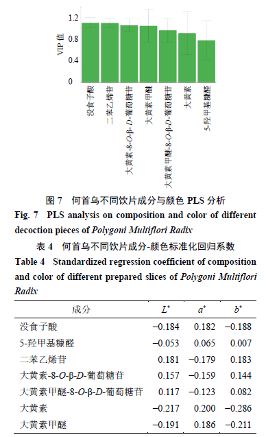 2.5何首烏不同飲片主要成分含量與顏色變化的相關(guān)性分析 普通多元線性回歸建模前提必須滿足樣本數(shù)量較多,變量數(shù)量較少,且變量之間無多重共線性的條件才具有合理性,若數(shù)據(jù)不能完全滿足上述條件,則模型無法使用。本實驗中變量較多,且成分之間存在多重共線性的問題,因此無法采用普通多元線性回歸模型。偏最小二乘回歸(partial least squares regression,PLS)法可以提取出對因變量解釋最強、影響最大的綜合變量,辨識系統(tǒng)中的信息與噪聲,因此很大程度上能夠克服變量之間的多重相關(guān)性在回歸建模中的不良作用,可以有效地解決在普通多元線性回歸的建模過程中因自變量之間存在多重相關(guān)性而影響參數(shù)估計的準(zhǔn)確性和合理性的問題,縮小模型誤差,增強模型的穩(wěn)健性[19]。 在PLS回歸模型中,R2X和R2Y分別表示模型對自變量和因變量的解釋能力,Q2表示模型的預(yù)測能力,通常認(rèn)為上述3個指標(biāo)以大于0.5為宜,越接近1表示模型擬合數(shù)據(jù)效果越好;自變量在解釋因變量時作用的重要性可以用變量投影重要性指標(biāo)(VIP)來度量,通常認(rèn)為VIP值大于1的自變量對因變量有顯著影響。 將測得的成分含量數(shù)據(jù)與顏色指標(biāo)L*、a*、b*值導(dǎo)入SIMCA 14.1軟件,以成分含量作為自變量,各顏色指標(biāo)作為因變量,建立PLS模型。建立的PLS模型R2X=0.991,R2Y=0.988,Q2=0.981,說明建立的模型穩(wěn)定且預(yù)測能力較強。根據(jù)VIP值>1的原則,可發(fā)現(xiàn)沒食子酸、二苯乙烯苷、大黃素-8-O-β-D-葡萄糖苷、大黃素甲醚對何首烏的各顏色指標(biāo)有顯著影響,5-羥甲基糠醛、大黃素甲醚-8-O- β-D-葡萄糖苷、大黃素對何首烏顏色無顯著影響。見圖7。 根據(jù)PLS模型的回歸系數(shù)(表4),沒食子酸、大黃素、大黃素甲醚的含量與L*、b*值呈負(fù)相關(guān),與a*值呈正相關(guān);5-羥甲基糠醛的含量與L*值呈負(fù)相關(guān),與a*、b*值呈正相關(guān);二苯乙烯苷、大黃素-8-O-β-D-葡萄糖苷、大黃素甲醚-8-O-β-D-葡萄糖苷的含量與L*、b*值呈正相關(guān),與a*值呈負(fù)相關(guān)。提示沒食子酸、大黃素、大黃素甲醚這3種成分與何首烏飲片變深、變紅、變藍(lán)有關(guān),與炮制后何首烏飲片顏色總體變化相一致;二苯乙烯苷、大黃素-8-O-β-D-葡萄糖苷、大黃素甲醚-8-O-β-D-葡萄糖苷這3種成分與何首烏飲片變淺、變綠、變黃有關(guān),與炮制后何首烏飲片顏色總體變化相反。