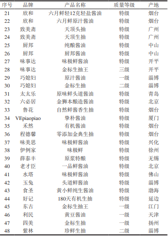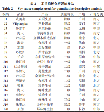 1、醬油樣品 釀造醬油樣品均隨機(jī)從市場(chǎng)購(gòu)買,且均采用高鹽稀態(tài)發(fā)酵工藝。開發(fā)醬油感官描述詞所用樣品共48 個(gè)(表1),包括我國(guó)釀造醬油的主要品牌,代表了中國(guó)釀造醬油的主要特色。感官定量描述分析所使用醬油樣品共20 種(表2),涵蓋了不同等級(jí)、不同產(chǎn)地的各類釀造醬油樣品。