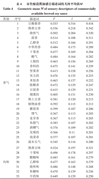 分別對(duì)48 種市售醬油樣品的81個(gè)感官描述詞進(jìn)行強(qiáng)度評(píng)價(jià),并計(jì)算每個(gè)描述詞的M值。根據(jù)M值的排序,篩選出55個(gè)描述詞,其M值均大于0.2(表4)。M值較大的香氣描述詞有豆瓣醬香、熟黃豆香、燒焦氣、甜香等26 個(gè)描述詞匯;風(fēng)味描述詞有熟黃豆味、干果味、醋酸味、乙醇味等20個(gè)風(fēng)味描述詞;基本味道有咸味、鮮味、酸味、甜味和苦味5 個(gè)描述詞;口感有辛辣的、澀味、刺痛感和金屬味4 個(gè)描述詞。從M值上看,醬油的風(fēng)味具有咸、鮮、酸、豆瓣醬香、熟黃豆香/味、燒焦氣等特征,這與我國(guó)醬油的加工原料、發(fā)酵工藝有關(guān)。