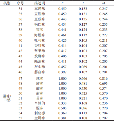 式中:F為描述詞實(shí)際被述及的次數(shù)占該描述詞所有可能被述及總次數(shù)的比率;I為評(píng)價(jià)小組實(shí)際給出的一個(gè)描述詞的強(qiáng)度和占該描述詞最大可能所得強(qiáng)度的比率。