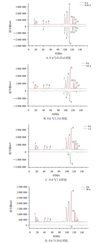 不同放置時間下兒童型香囊的氣味信息鏡像對比圖見圖2。由圖2可知,兒童型香囊放置0.25d后,有5種氣味成分消失。與放置0d相比,放置0.25d后,7號峰強(qiáng)度下降了45.8%,8號峰強(qiáng)度下降了21.8%,9號峰強(qiáng)度下降了14.4%;放置3.5d后,7號峰強(qiáng)度下降了90.8%,8號峰強(qiáng)度下降了70.1%,9號峰強(qiáng)度下降了50.8%;放置7d后,大部分氣味成分基本消失,9號峰強(qiáng)度下降了56.8%;放置30d后,9號峰基本消失。