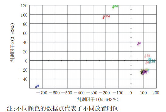 兒童型香囊色譜數(shù)據(jù)的判別因子分析結(jié)果顯示,判別因子1的貢獻(xiàn)率為95.643%,判別因子2的貢獻(xiàn)率為3.582%,累計貢獻(xiàn)率為99.225%,這說明判別因子分析模型可明顯區(qū)分不同放置時間的兒童型香囊樣品(圖5)。由圖5可知,放置0.25d的香囊氣味成分與放置0d的香囊可明顯區(qū)分;從放置3.5d開始,隨著放置時間的延長,樣品點聚集,說明氣味成分變化越來越小。結(jié)合色譜圖的分析結(jié)果可知,放置7d的兒童型香囊的功能性成分已經(jīng)基本揮發(fā)??梢?,判別因子分析結(jié)果與色譜圖分析結(jié)果一致。