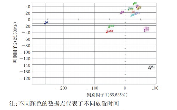 圖6 不同放置時間成人型香囊樣品判別因子分析圖