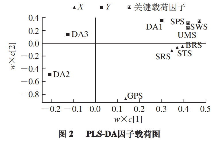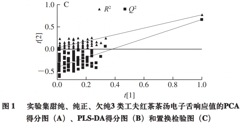 為探索電子舌檢測能否用于工夫紅茶茶湯滋味的判別,以電子舌7 個(gè)傳感器響應(yīng)值為X變量,以茶湯滋味分組(甜純、純正、欠純)為Y變量做PLS-DA。PLS-DA是一種有監(jiān)督的模式識(shí)別方法,相對(duì)于PCA所得的投影通??色@得更好的分類效果。如圖1B所示,3 類(甜純、純正、純)茶湯的聚類結(jié)果類似于PCA的結(jié)果(R2x =1,R2Y =0.61,Q2 =0.512)。Q2 大于0.5,表明模型具有較好的預(yù)測能力。過擬合是PLS-DA模型的一個(gè)常見問題。為進(jìn)一步驗(yàn)證PLS-DA模型的可靠性,對(duì)該模型進(jìn)行置換檢驗(yàn)驗(yàn)證(圖1C)。將模型建立時(shí)定義的Y矩陣的變量隨機(jī)排列100 次,得到R2和Q2 截距分別為(0.0,0.029)和(0.0,-0.399),表明PLS-DA模型穩(wěn)定可靠,未存在過擬合,可用于不同滋味的判別。