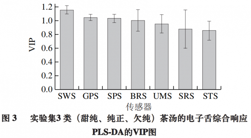 為進(jìn)一步探明電子舌7 根傳感器的響應(yīng)值對(duì)滋味分組的貢獻(xiàn),篩選出影響甜純滋味識(shí)別的關(guān)鍵傳感器,將上述PLS-DA模型做載荷分析。如圖2所示,對(duì)甜純滋味識(shí)別影響較大的變量可能為SWS(甜)、UMS(鮮)、SPS(綜合),其w×c值分別為0.47、0.42、0.42,以變量SWS(甜)貢獻(xiàn)為最大。進(jìn)一步采用變量投影重要性(variable important for the projection,VIP)篩選關(guān)鍵差異變量,如圖3所示。結(jié)果表明,VIP值大于1.0的變量包括SWS(甜)、GPS和SPS(復(fù)合味覺)及BRS(苦),其中以SWS(甜)的VIP值為最高。SWS甜味傳感器對(duì)甜純組茶湯的響應(yīng)顯著高于純正組和欠純組(P<0.001),而對(duì)于純正組和欠純組的響應(yīng)差異則不顯著(圖4)。上述結(jié)果表明SWS甜味傳感器可能是識(shí)別甜純滋味的關(guān)鍵因子。