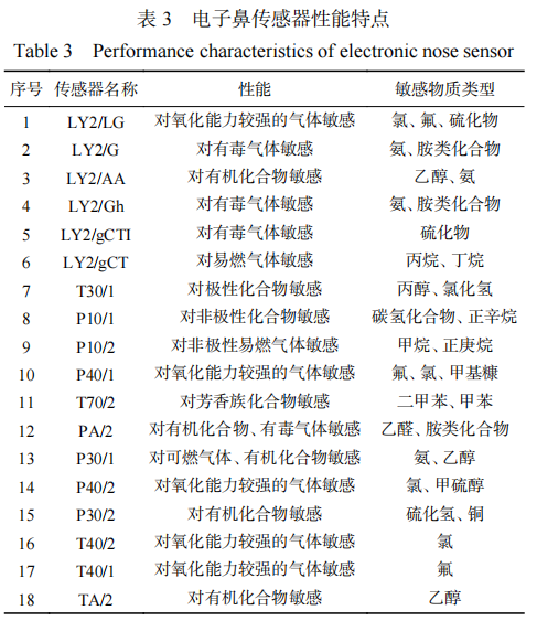 電子鼻分析 法國產(chǎn)電子鼻是通過MXT-5(弱極性)和MXT-7(中極性)色譜柱分離氣味物質(zhì),一共由18根金屬氧化傳感器組成,每根傳感器對應(yīng)一類或幾類物質(zhì)敏感,采用氫離子檢測器分析色譜信息,完成檢測后,即可使用儀器自帶數(shù)據(jù)庫對樣品揮發(fā)性物質(zhì)進行定性、定量分析。電子鼻傳感器性能特點見表3。