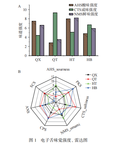 圖1A是電子舌味覺信號強度圖,可見酸味強度值(AHS):HT>QX>HB>QT,且樣品HT與樣品QT酸味強度值相差5.2,差異顯著;咸味強度值(CTS):QT>HB>HT>QX,且樣品QT與樣品QX咸味強度值相差4.9,差異明顯;鮮味強度值(NMS):HT>QX>HB>QT,且樣品HT與樣品QT鮮味強度值相差4.7,差異明顯。電子舌味覺信號強度差異表明牦牛肉不同部位滋味差異明顯。