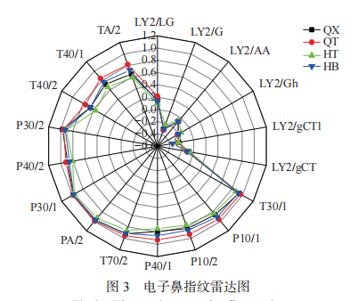 四個部位電子鼻氣味指紋雷達圖3表明:樣品HT在P10/1、P10/2、P40/1與其他樣品出現(xiàn)差異,P型傳感器一般對極性化合物和非極性化合物敏感;樣品HT與QT在T40/2、T40/1、TA/2區(qū)分較為明顯,而T型傳感器對氧化氣體和含硫化合物敏感,說明在含硫化合物含量上樣品HT與樣品QT差異較大。