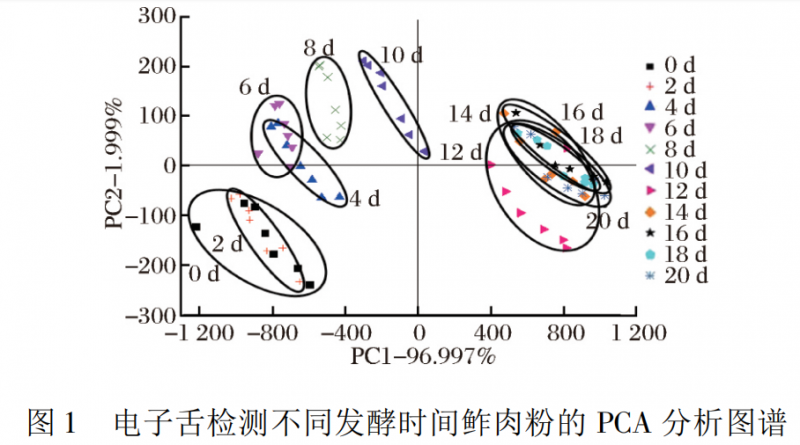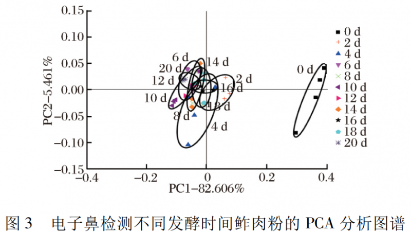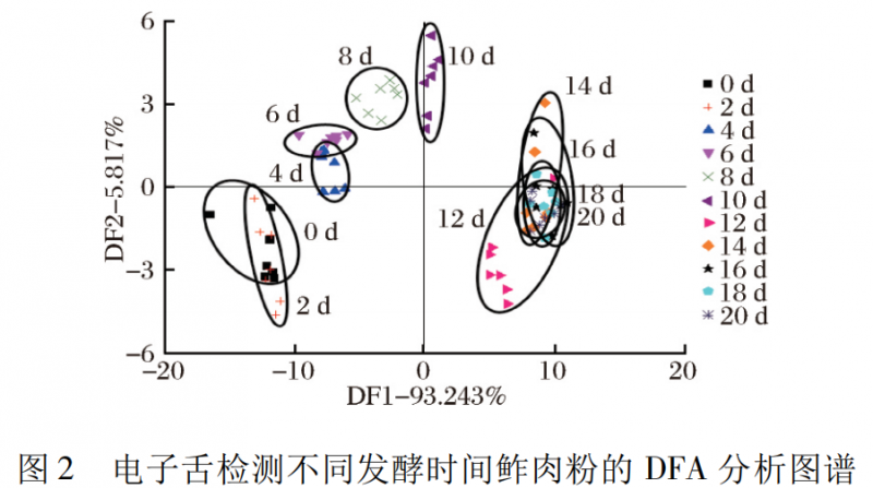 從圖 1 和圖 2 可以看出,在鲊肉粉發(fā)酵第 0 ~ 10 天,鲊肉粉樣品沿第一主成分增大的方向移動(dòng),說明隨著發(fā)酵時(shí)間的延長(zhǎng),鲊肉粉發(fā)酵產(chǎn)生的滋味物質(zhì)也隨之改變,從 PCA 圖譜得出第 12 ~ 20 天絕大部分重疊在一起,說明鲊肉粉的滋味物質(zhì)沒有明顯改變; 從DFA 圖譜得出第 12 ~ 16 天鲊肉粉從左下方向右上方移動(dòng)且小部分與第 18 天和第 20 天重疊,說明鲊肉粉在中后期鲊肉粉滋味物質(zhì)隨時(shí)間延長(zhǎng)而改變至趨于穩(wěn)定,經(jīng)對(duì)比分析,DFA 比 PCA 能更好地分析隨時(shí)間改變鲊肉粉滋味物質(zhì)的不同。