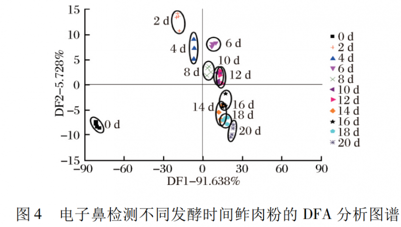 通過 PCA 和 DFA 分析得出,電子舌能有效地區(qū)分不同發(fā)酵時(shí)間鲊肉粉風(fēng)味物質(zhì)的變化,并且 DFA 比 PCA 能更好地分辨出鲊肉粉風(fēng)味的變化; 電子鼻能有效地分析出不同發(fā)酵時(shí)間鲊肉粉揮發(fā)性風(fēng)味物質(zhì)的變化,特別是第 0 天顯著差異于其他發(fā)酵時(shí)間的鲊肉粉,其中 DFA 比 PCA 更好的分辨出鲊肉粉風(fēng)味物質(zhì)的變化。