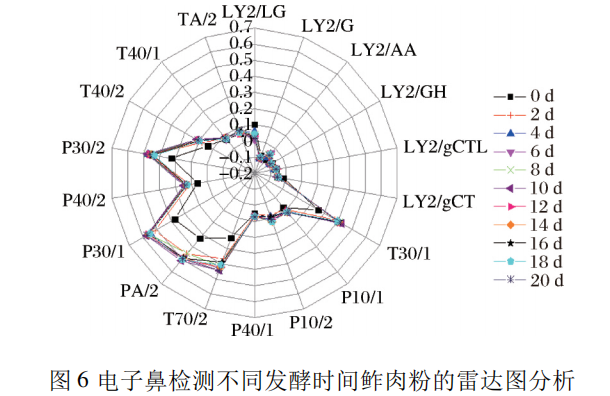 如圖 6 所示,傳感器 T40 /2、P30 /2、P40 /2、P30 / 1、PA/2、T70 /2 和 T30 /1 響應(yīng)信號(hào)的強(qiáng)度均隨鲊肉粉發(fā)酵時(shí)間的增加而增強(qiáng),傳感器 P30 /2、P30 /1、PA/2、 T70 /2 和 T30 /1 對(duì)各組鲊肉粉樣品的響應(yīng)值都較大,且發(fā)酵第 0 天和其他發(fā)酵時(shí)間響應(yīng)值有差異顯著,說明第 0 天的鲊肉粉樣品中的揮發(fā)性風(fēng)味成分與其他發(fā)酵時(shí)間的鲊肉粉樣品顯著不同; 傳感器 LY2 /LG 的信號(hào)強(qiáng)度隨鲊肉粉發(fā)酵時(shí)間的增加而減弱; 傳感器T40 /1、TA/2、LY2 /G、LY2 /AA、LY2 /GH 和 LY2 / gCTL 對(duì)不同發(fā)酵時(shí)間鲊肉粉的響應(yīng)值基本一致,傳感器 LY2 /gCT、P10 /1 和 P10 /2 對(duì)不同發(fā)酵時(shí)間鲊肉粉樣品的響應(yīng)值雖有差異,但無明顯規(guī)律。