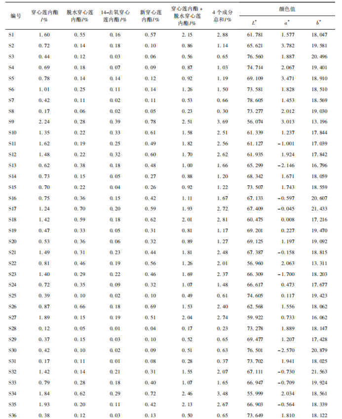 表4 穿心蓮粉末色度值與4個二萜內(nèi)酯類成分含量的相關(guān)性分析