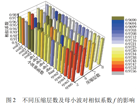 由于電子鼻每檢測一次就會產(chǎn)生 6000 個原始數(shù)據(jù),這些數(shù)據(jù)信息量大、高維、含噪聲,難以直接進行模式識別分析,根據(jù)電子鼻檢測信號特點,本實驗利用 Matlab 軟件平臺,采用離散小波變換( DWT) 進行數(shù)據(jù)預處理,分別采用 Coiflets、Daubechies、haar、Symlets 小波函數(shù)作為小波基函數(shù)對原始信息進行5~8層壓縮分解,波形相似系數(shù) f 變化情況如圖 2 所示。對比發(fā)現(xiàn),以 sym4 為小波基函數(shù)經(jīng) 6 層壓縮效果最好,相似系數(shù) f 為 0.975 6,可將 6000 個數(shù)據(jù)減小至 47 個數(shù)據(jù)。