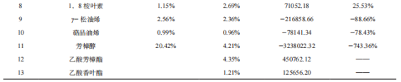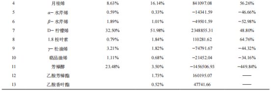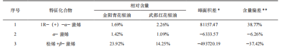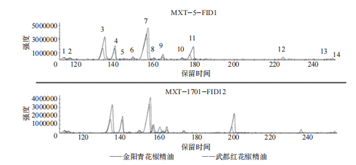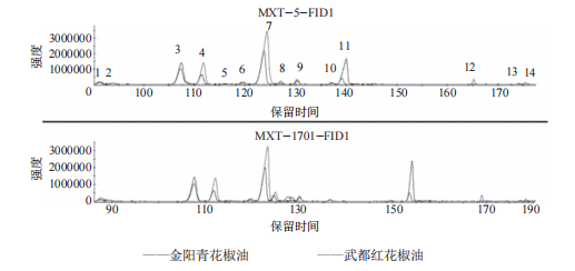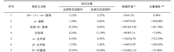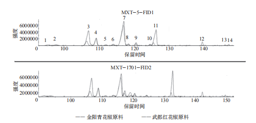 花椒作物在我國很多地區(qū)都有種植,花椒的揮發(fā)油是花椒香氣的主要來源,也是反映花椒香氣的主要指標(biāo),花椒中揮發(fā)油的含量及組成成分不僅受到花椒品種、產(chǎn)地環(huán)境因子(如產(chǎn)地氣候、雨量、日照時(shí)間、土質(zhì)等)的影響,還受到提取加工方法、提取部位和采收時(shí)期等外在因素的影響。 超快速氣相電子鼻技術(shù)具有分析速度快、靈敏度高和檢測費(fèi)用低等優(yōu)點(diǎn)。超快速氣相電子鼻將雙快速氣相色譜檢測與基于多變量統(tǒng)計(jì)的強(qiáng)大數(shù)據(jù)處理和感官及化學(xué)表征(Arochembase)的可選模塊相結(jié)合,利用超快速氣相電子鼻技術(shù),解析不同品種花椒及花椒提取物揮發(fā)性化合物,通過主成分分析建立產(chǎn)品有效判別模型,同時(shí)解析花椒物質(zhì)構(gòu)成。 不同產(chǎn)地花椒原料、花椒精油產(chǎn)品、花椒油產(chǎn)品、nC6-nC16標(biāo)準(zhǔn)溶液。 超快速氣相電子鼻;零空氣發(fā)生器;氫氣發(fā)生器;20mL頂空進(jìn)樣瓶,電子天平。 花椒:取0.2g花椒顆粒于20mL頂空進(jìn)樣瓶中,迅速加蓋密封檢測,設(shè)置3個(gè)平行樣品,降低檢測誤差。 花椒精油:將花椒精油搖晃均勻后,取20uL于20mL頂空進(jìn)樣瓶中,加蓋密封檢測,每個(gè)樣品設(shè)置3個(gè)平行樣。 花椒油:將花椒油搖晃均勻后,使用電子天平稱取0.1g于20mL頂空進(jìn)樣瓶中,加蓋密封檢測,設(shè)置3個(gè)平行樣品。 花椒原料:樣品量0.2g,進(jìn)樣體積500uL,孵化溫度80℃,孵化時(shí)間20min,50℃恒溫30s,1℃/s速率升溫至80℃恒溫30s,3℃/s速率升溫至125℃恒溫10s,3℃/s速率升溫至250℃恒溫11s。 花椒精油:取樣量100μL,捕集溫度40℃,孵化溫度60℃,孵化時(shí)間10min,載氣流量30mL/min;進(jìn)樣量1000uL,進(jìn)樣口溫度200℃,閥溫度為250℃;FID溫度260℃,升溫程序:初始溫度45℃,保持35s,1.0℃/s升至70℃,保持30s,0.5℃/s升至140℃,3.0℃/s升至250℃,保持21s,采集時(shí)間共計(jì)288s。花椒油:取樣量0.1g,捕集溫度40℃,孵化溫度60℃,孵化時(shí)間20min,載氣流量30mL/min;進(jìn)樣量500uL,進(jìn)樣口溫度200℃,閥溫度為260℃,F(xiàn)ID溫度為260℃,升溫程序:初始溫度50℃,保持30s,1.0℃/s升至85℃,保持30s,1.0℃/s升至125℃,保持10s,3.0℃/s升至250℃,保持10s,采集時(shí)間共計(jì)197s。 將裝有樣品的頂空小瓶按照順序依次放入樣品盤,每3個(gè)平行樣品后面放入一個(gè)空瓶,目的是為了消除樣品帶來的信號(hào)干擾,選擇程序進(jìn)行樣品分析。 使用Heracles超快速氣相電子鼻自帶軟件Alphasoft進(jìn)行樣品數(shù)據(jù)處理,明確揮發(fā)性風(fēng)味物質(zhì)種類與含量。 利用正構(gòu)烷烴標(biāo)準(zhǔn)溶液(nC6-nC16)進(jìn)行校準(zhǔn),進(jìn)行保留時(shí)間與保留參數(shù)之間的轉(zhuǎn)換,利用超快速氣相電子鼻自帶數(shù)據(jù)庫AroChembase數(shù)據(jù)庫對樣品中的成分進(jìn)行定性分析,采用峰面積歸一法對目標(biāo)化合物進(jìn)行定量分析,確定各香氣成分相對含量。 采用正構(gòu)烷烴標(biāo)準(zhǔn)溶液(nC6-nC16)對檢測方法進(jìn)行校準(zhǔn),結(jié)合超快速氣相電子鼻自帶AroChembase數(shù)據(jù)庫對樣品中主要揮發(fā)性成分進(jìn)行定性分析,推測得到匹配度高的化合物。 通過對比色譜圖(圖1)發(fā)現(xiàn),樣品間的出峰時(shí)間及出峰位置基本一致,峰面積間存在差異,說明樣品中揮發(fā)性成分的種類基本一致,含量上存在略微差異。 青花椒原料中共分析出11種含量較高成分,紅花椒原料中共分析出13種含量較高成分,乙酸芳樟酯與乙酸香葉酯在青花椒中未曾檢測出。通過計(jì)算,可知青、紅花椒不僅成分種類上有差異,各成分含量上同樣差異明顯。除1R-(+)-α-蒎烯、1,8桉葉素、乙酸芳樟酯、乙酸香葉酯外,其他成分均是青花椒中含量較紅花椒高。其中,青紅花椒原料中芳樟醇含量差別最大,差異最為明顯,D-檸檬烯含量差別較大,但相對偏差不大,推斷不是造成青紅花椒風(fēng)味不同的主要差異。乙酸芳樟酯、乙酸香葉酯僅存在于紅花椒原料中,由此可利用花椒原料產(chǎn)品中芳樟醇、乙酸芳樟酯、乙酸香葉酯含量區(qū)分花椒原料種類。 表1 武都紅花椒、金陽青花椒原料特征化合物相對含量與峰面積差異 青花椒精油中共分析出11種含量較高成分,紅花椒精油中共分析出13種含量較高成分,乙酸芳樟酯與乙酸香葉酯在青花椒中未曾檢測出,與原料表現(xiàn)一致。通過計(jì)算峰面積差值和含量偏差可知,乙酸芳樟酯等酯類物質(zhì)僅存在于紅花椒中。1R-(+)-α-蒎烯、月桂烯、D-檸檬烯、1,8桉葉素在紅花椒精油中含量較高,其他組分在青花椒精油中含量較高,和原料情況不一致,可能和提取工藝有關(guān)。其中芳樟醇含量差別最大,差異最為明顯,乙酸芳樟酯、乙酸香葉酯僅存在于紅花椒精油產(chǎn)品中,由此可利用花椒精油產(chǎn)品中檜烯、β-蒎烯、芳樟醇含量和乙酸芳樟酯、乙酸香葉酯等酯類物質(zhì)存在與否來區(qū)分花椒精油種類。 表2 武都紅花椒精油、金陽青花椒精油特征化合物相對含量與峰面積差異