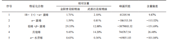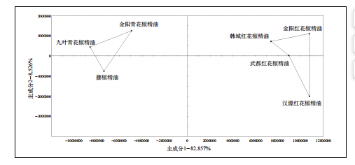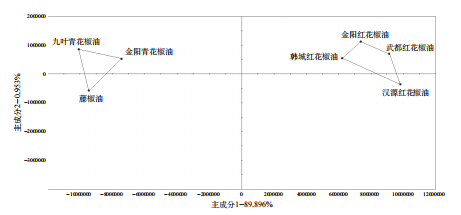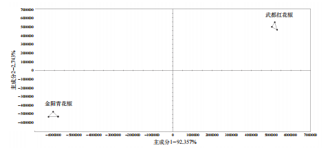 青花椒油中共分析出11種含量較高成分,紅花椒油中共分析出13種含量較高成分,乙酸芳樟酯與乙酸香葉酯在青花椒油中未曾檢測出。 通過計(jì)算峰面積差值和含量偏差可知,乙酸芳樟酯等酯類物質(zhì)僅存在于紅花椒油中,與精油情況一致,青紅花椒油中芳樟醇含量差別最大,差異最為明顯,乙酸芳樟酯僅存在于紅花椒原料中,由此可利用花椒精油產(chǎn)品中檜烯、β-蒎烯、芳樟醇含量和乙酸芳樟酯、乙酸香葉酯等酯類物質(zhì)存在與否來區(qū)分花椒精油種類。對青紅花椒原料及花椒提取物進(jìn)行指紋圖譜與物質(zhì)定性分析,青紅花椒在成分種類上有差異,紅花椒成分較青花椒復(fù)雜,主要體現(xiàn)在乙酸芳樟酯、乙酸香葉酯等酯類和醛類物質(zhì)上;青紅花椒各成分相對含量上差異明顯,其中芳樟醇、檜烯差異最為明顯,D-檸檬烯含量差別大,但差異貢獻(xiàn)度不大;芳樟醇、乙酸芳樟酯等成分可用來鑒別青紅花椒產(chǎn)品類別,且電子鼻分析速度快,可大大節(jié)約成本。 表3 武都紅花椒油、金陽青花椒油特征化合物相對含量與峰面積差異 主成分分析(PCA)是一種常見的多元統(tǒng)計(jì)方法,主要通過將采集的多指標(biāo)進(jìn)行數(shù)據(jù)轉(zhuǎn)換與降維,使用線性分類處理降維的特征向量,盡可能捕集數(shù)據(jù)集間最大差異,從整體層面上直觀地展示樣品分布。對花椒原料、花椒精油、花椒油進(jìn)行主成分分析,由圖4原料主成分分析可以看出,兩種花椒原料之間存在顯著差異,現(xiàn)有數(shù)據(jù)可對未知產(chǎn)地的原料進(jìn)行產(chǎn)地區(qū)分,前提是原料來自兩個(gè)產(chǎn)地。后續(xù)可收集其余產(chǎn)地花椒原料,積累大量數(shù)據(jù),建立原料質(zhì)量標(biāo)準(zhǔn),對實(shí)際應(yīng)用中采購、生產(chǎn)、銷售提供指導(dǎo)性建議。 對6類花椒精油樣品進(jìn)行PCA分析,結(jié)果如圖5所示,PC1與PC2相加大于91.38%,代表被檢測樣品中絕大部分信息,說明實(shí)驗(yàn)的花椒精油樣品成分存在差異,呈現(xiàn)不同類型風(fēng)味,主成分分析能對不同種類花椒精油進(jìn)行識(shí)別與區(qū)分。 對四類花椒油樣品進(jìn)行PCA分析,結(jié)果如圖6所示,PC1方差貢獻(xiàn)率為89.896%,PC2的方差貢獻(xiàn)率為0.953%,兩者累計(jì)方差為90.849%,主成分顯示樣品中絕大部分信息,說明實(shí)驗(yàn)的花椒油樣品成分存在差異,呈現(xiàn)不同類型風(fēng)味,主成分分析能對不同種類花椒油進(jìn)行識(shí)別與區(qū)分。 利用超快速氣相電子鼻技術(shù),解析不同產(chǎn)地花椒及花椒提取物指紋圖譜,明確花椒及花椒提取物揮發(fā)性風(fēng)味物質(zhì),芳樟醇、乙酸芳樟酯等成分可用來鑒別青紅花椒產(chǎn)品類別,且電子鼻分析速度快,可大大節(jié)約成本,利用超快速氣相電子鼻技術(shù)可識(shí)別花椒中的關(guān)鍵香氣成分,為花椒品種篩選、產(chǎn)地識(shí)別和深加工提供理論依據(jù)。
