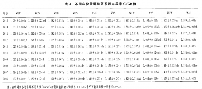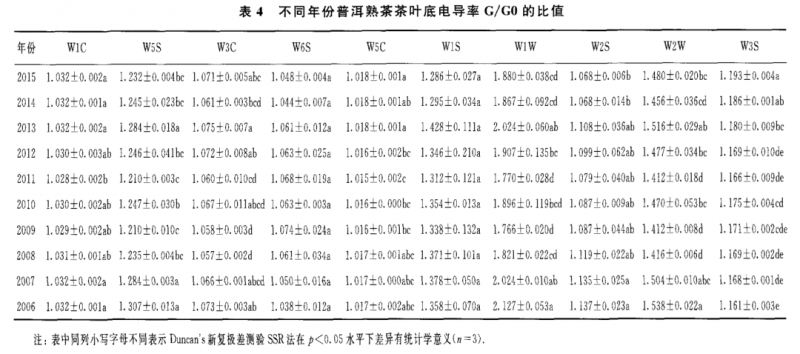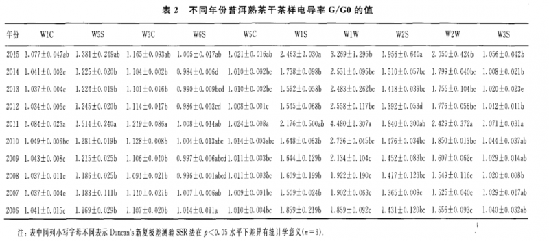 表 2至表 4為 10 個(gè)不同年份普洱熟茶的干茶、茶湯和葉底的具體的電導(dǎo)率 G/GO值。從表 2可知,對干茶香氣 G/GO值最大的傳感器是 w1w 和 W1S,其次是 w2w 和 W2S,其他 6個(gè)傳感器的 G/GO值較低;對茶湯香氣 G/GO值最大的傳 感器是 w1w 和 w2w ,其次是 W1S和 W5S,其他 6個(gè)傳感器的 G/GO值較低(表 3);葉底香氣 G/G0值的貢獻(xiàn)率大小順序與茶湯的相同,即為傳感器 w1w>w2w >w1s>w 5s(表4)。由表1所示的10個(gè)傳感器的性能可知,W1S傳感器對甲烷類揮發(fā) 性成分敏感,w1w ,w2w ,W2S和W 5S分別對硫化物,芳香成分、有機(jī)硫化物 ,乙醇和氮氧化合物等揮發(fā)性成分敏感。另外,不同年份普洱熟茶的香氣物質(zhì)不論 是干茶 、茶湯和葉底在其組成上基本一致 ,只是在干茶中乙醇?xì)怏w比和氮氧化合 物更為豐富。總體來看,上述幾類揮發(fā)性成分的含量在干茶中含量最高,茶湯次之 ,葉底最低;其中2011年干茶對 w 1s,w1w ,w2w ,W2S和 W5S傳感器的電導(dǎo)率基本上是所有茶樣中最高的。隨著貯藏年份的增加,上述幾類揮發(fā)性成分的含量 在干茶和茶湯中呈顯著的上升趨勢,在葉底中呈顯著的下降趨勢。