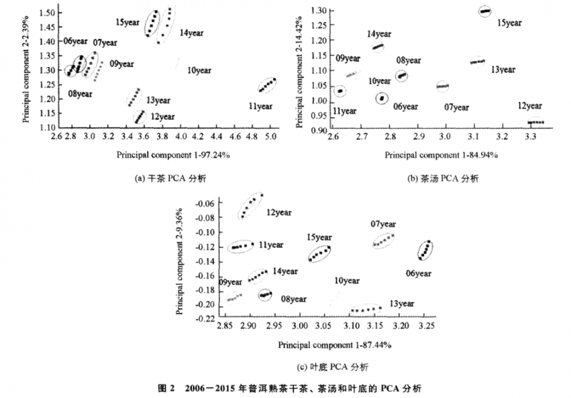 對干茶、茶湯和葉底香氣物質(zhì)進(jìn)行 PCA 分析 (選取 55~60S的 6個(gè)檢測信號 ),干茶 (圖 2a)、茶湯 (圖2b)和葉底(圖 2c)的 PCA 分析結(jié)果顯示:干茶 、茶湯和葉底 的第一主成分區(qū)分貢獻(xiàn)率分別達(dá)到 97.24% ,84.94%和87.44 %,第二主成分區(qū)分 貢獻(xiàn)率分別達(dá)到 2.39% ,14.42% 和 9.36 %,兩個(gè)主成分區(qū)分的累計(jì)貢獻(xiàn)率分別 達(dá)到 99.63% ,99.36% 和 96.80% ,說明這兩個(gè)主成分已經(jīng)基本代表了樣品的主 要信息特征,PCA分析具有可行性。另外,在 PCA 的散點(diǎn)圖中 ,不同年份普洱熟茶香氣成分的數(shù)據(jù)采集點(diǎn)所在的橢圓形區(qū)域除2006年 至 2009年 的干茶之間以及 2009年與2010年的茶湯之間有部分重疊外 (圖 2a,2b),其余的都分布在特定的區(qū)域中,說明不同儲(chǔ)藏年份普洱熟茶的香氣有較大的差異,PCA分析可以將不同儲(chǔ)藏年份的普洱熟茶香氣歸類,并加以區(qū)分,且區(qū)分效果良好。