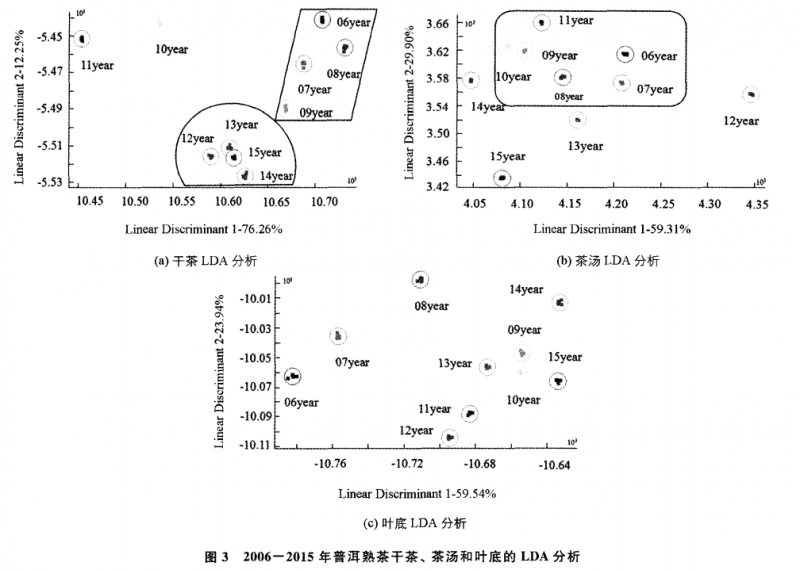 由 LDA判別因子分析圖(圖 3)可知,10個(gè)不同年份普洱熟茶干茶 (圖 3a)的LinearDiscriminant1和LinearDiscriminant2的貢獻(xiàn)率分別達(dá)到 76.26% 和 12.25% ,兩判別式的總貢獻(xiàn)率為 88.51%,相互之問都能明顯的區(qū)分,香氣的數(shù)據(jù) 采集點(diǎn)有不同的分布區(qū)域。其中 ,2010年和 2011年茶樣相互之間的距離較遠(yuǎn),2006—2009年的 4個(gè)茶樣分布在距離較近的同一區(qū)域,2012~2015年 4個(gè)茶樣也 同樣分布在距離較近的同一區(qū)域,且兩區(qū)域相互間距離較近,但兩區(qū)域距離 2010年和 2011年的區(qū)域較遠(yuǎn),且 2013年 和 2015年存在重疊現(xiàn)象,說明儲(chǔ)藏年份相近 的普洱熟茶干茶中可能含有共同的香氣物質(zhì),同時(shí)也說明隨著儲(chǔ)藏年份的增加香氣成分會(huì)產(chǎn)生明顯的變化,也說明 LDA法可以區(qū)分不同儲(chǔ)藏年份的普洱熟茶,與 PCA 的分析結(jié)果相互驗(yàn)證 。茶湯 (圖 3b)的 LinearDiscriminant1的貢獻(xiàn)率達(dá)到 59.3l% ,LinearDiscriminant2的貢獻(xiàn)率達(dá)到 29.90%,兩判別式的總貢獻(xiàn)率為 89.21% 。從圖 3b可以看出,除 2012年和 2015年的茶湯香氣數(shù)據(jù)采集點(diǎn)相互之問的距離較遠(yuǎn)外,其余的幾個(gè)集中分布在離 Y=0最遠(yuǎn)的區(qū)域 ,且各個(gè)茶樣都沒有存在重 疊現(xiàn)象,說明茶湯的香氣存在差異,且區(qū)分效果比干茶好葉底 (圖 3c)的LinearDiscriminant1和 LinearDiscriminant2的貢獻(xiàn)率分別達(dá)到 59.54% 和 23.94% ,兩判別式的總貢獻(xiàn)率為83.48% ,相互之間都能明顯的區(qū)分,香氣的數(shù)據(jù)采集點(diǎn)有不同的分布區(qū)域,且儲(chǔ)藏年份相近的茶樣分布在同一區(qū)域,說明儲(chǔ)藏年份 相近的普洱熟茶葉底中可能含有共同的香氣物質(zhì),同時(shí)也說明隨著儲(chǔ)藏年份的增加 香氣成分會(huì)產(chǎn)生明顯的變化。綜上所述,無 論是PCA 分析還是 LDA分析,都能將 普洱熟茶香氣較好地區(qū)分開,且 PCA 分析結(jié)果明顯優(yōu)于 LDA 分析結(jié)果,而且年份 差別越大,分離效果越好。