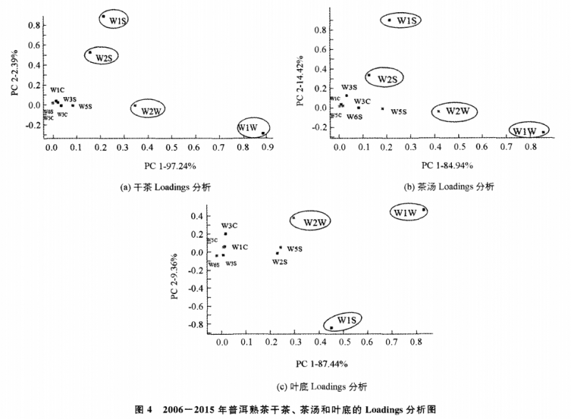 本研究中的Loadings分析法主要是對傳感器進(jìn)行研究,利用該方法可以確認(rèn)特定試 驗(yàn)樣品下各傳感器對樣品區(qū)分的貢獻(xiàn)率大小,從而考察在樣品區(qū)分過程中哪一類氣 體起了主要區(qū)分作用。干茶的 Loadings分析結(jié)果如圖 4a,傳感器 w1w (對硫化物 敏感 )的位點(diǎn)距離x=0最遠(yuǎn),說 明 W1W 對第一主成分的貢獻(xiàn)率最大,傳感器 W2W (對芳香成分 、有機(jī)硫化物靈敏 )次之;而傳感器W1s(對甲烷敏感 )的位點(diǎn)距離 y=0最遠(yuǎn),說明其對第二主成分貢獻(xiàn)率最大,傳感器 w2s(對乙醇敏感 )次之。茶湯的 Loadings分析結(jié)果如圖 4b,傳感器對主成分的貢獻(xiàn)率與干茶的完全相同,即 w1w 對第一主成分的貢獻(xiàn)率最大,傳感器 w2w 次之;而傳感器 w1S對第二主成分貢獻(xiàn) 率最大,傳感器 W2S次之。葉底的 Loadings分析結(jié)果如圖 4c,傳感器 w1w 的位 點(diǎn)距 x=0和 y=0都較遠(yuǎn),說明其對第一、第二主成分的貢獻(xiàn)都較大,而 w2w 距y=0最遠(yuǎn),說明其對第二主成分貢獻(xiàn)率最大,傳感器 w1s對第一主成分的貢獻(xiàn)次于 w1w。