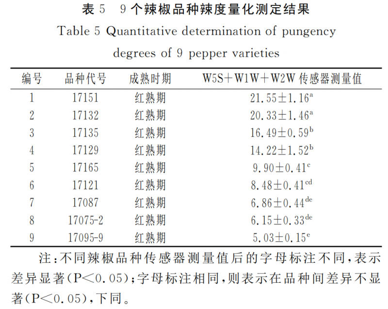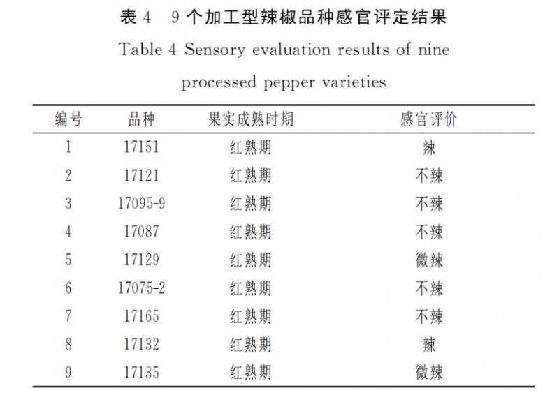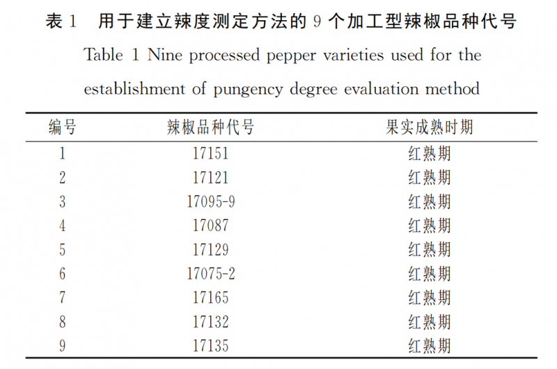 9個(gè)辣椒品種辣度測(cè)定結(jié)果