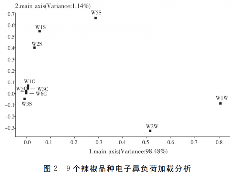 負(fù)荷加載分析(Loadings)與 PCA 分析是相關(guān)的,基于同一種算法,區(qū)別在于 Loadings分析是針對(duì)電子鼻傳感器貢獻(xiàn)率進(jìn)行研究。電子鼻共有10個(gè)傳感器,不同傳感器可以反映樣品中揮發(fā)性氣味的響應(yīng)值,傳感器數(shù)值離原點(diǎn)越遠(yuǎn),說(shuō)明該傳感器識(shí)別能力越強(qiáng),反之則越弱。由圖2可知,在第一主成分中,W1W 傳感器識(shí)別作用最強(qiáng),其次是 W2W 傳感器,這2個(gè)傳感器與其余傳感器相比,距原點(diǎn)的距離明顯較遠(yuǎn),識(shí)別能力強(qiáng)。在第二主成分中,W5S傳感器距原點(diǎn)距離明顯遠(yuǎn)于其余傳感器,綜合來(lái)看,W5S、W1W、W2W 傳感 器對(duì)9 種辣椒品種的辣度評(píng)價(jià)起到了主要作用,這與圖1中的辣度均值分析結(jié)果相吻合。