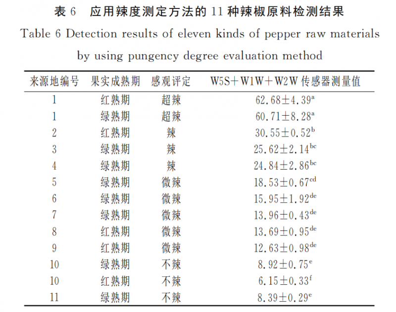 由表6可知,11種辣椒原料存在顯著性差異,說(shuō)明利用電子鼻可以有效區(qū)分辣椒品種。且所有紅熟期辣椒、所有綠熟期辣椒和同一品種紅綠果辣椒辣度測(cè)定結(jié)果均與上述結(jié)果吻合:感官評(píng)價(jià)為不辣的辣椒原料,其 W5S、W1W、W2W 數(shù)值之和在1~10之 間;感官評(píng)價(jià)為微辣的辣椒原料,其 W5S、W1W、W2W 傳感器辣度值之和在10.1~20之間;感官評(píng)價(jià)為辣的辣椒原料,其 W5S、W1W、W2W 傳感器辣度值之和在20.1~50,其中,魔鬼椒的 W5S、W1W、W2W 傳感器辣度值之和大于50.1,評(píng)定為超辣,證明電子鼻測(cè)定辣椒辣度的可行性。