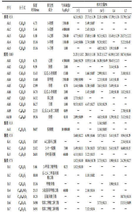以正構(gòu)烷烴的實(shí)際測(cè)量值校正保留時(shí)間,SPME-GC-MS測(cè)定結(jié)果通過(guò)NIST98數(shù)據(jù)庫(kù)(NIST08,華盛頓特區(qū))進(jìn)行檢索,取匹配度80%以上的揮發(fā)性成分;以2-氯苯甲醛為內(nèi)標(biāo)物對(duì)各化合物進(jìn)行定量分析。