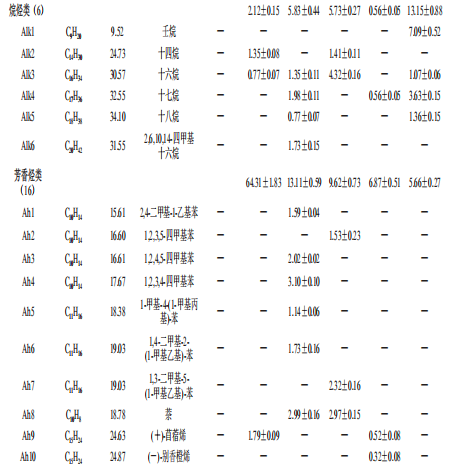 5種金針菇中共檢測(cè)出6種烷烴類(lèi)化合物,特有化合物2種,分別為壬烷和2,6,10,14-四甲基十六烷。