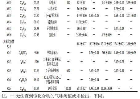 5種金針菇中共檢測(cè)出5種其他類(lèi)化合物,獨(dú)有化合物有2種,分別為2-甲基-2-(1-甲基乙基)環(huán)氧乙烷和4,5,6,7-四氫-3,6-二甲基-苯并呋喃。